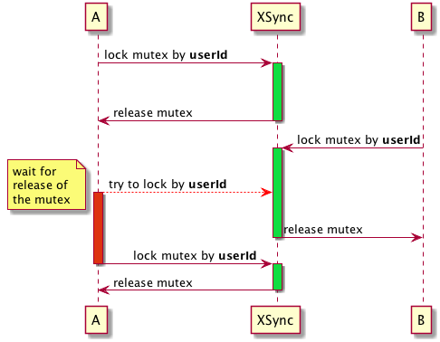 1 2 3 4 5 6 7 8 9 10 11 12 13 @Autowired private XSync<UUID> xSync;public void withdrawMoney (UUID userId, int amountOfMoney) { xSync.execute(userId, () -> { Result result = externalPolicySystem.validateTransfer(userId, amountOfMoney, WITHDRAW); accountService.transfer(userId, amountOfMoney, WITHDRAW); }); } public void purchase (UUID userId, int amountOfMoney, VendorDescription vendor) { xSync.execute(userId, () -> { .. }); }